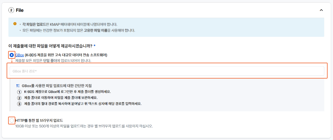 - 데이터 등록 전, GBox 전송 시스템을 통하여 데이터 업로드 진행 (GBox 참고) / - 제출할 모든 파일은 단일 폴더에 업로드한 다음 해당 경로를 입력함