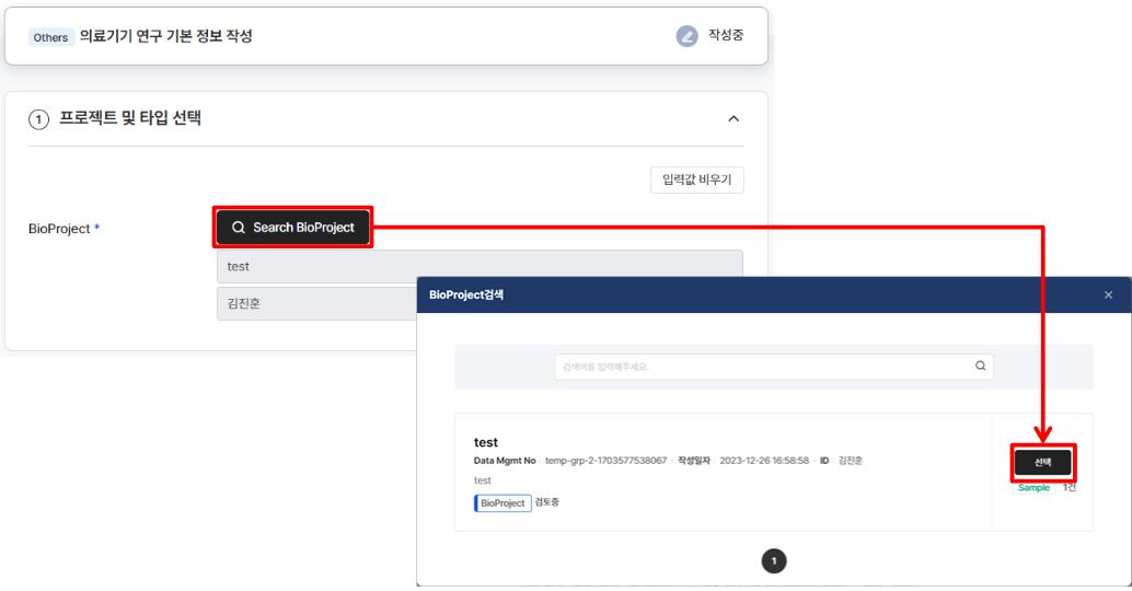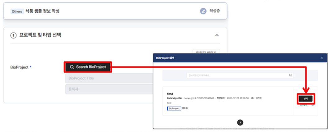 - 프로젝트/샘플이 검색되지 않으면 [신규 바이오 프로젝트/샘플 등록] 필요