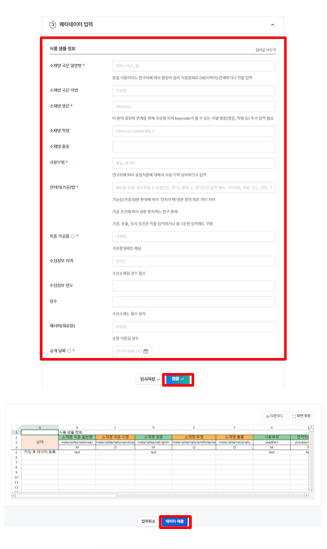 - 연구소재의 종·부위 명, 배양 조건 정보, 실험기기 정보 등 실험 결과를 얻는데 활용한 소재·실험방법 등에 대한 정보